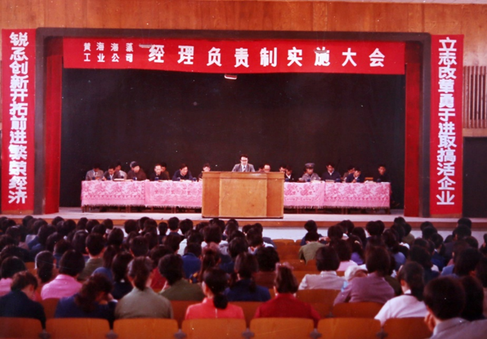 1985年10月,黃海海藻工業(yè)公司經(jīng)理負責制實施大會,時任經(jīng)理苗深義