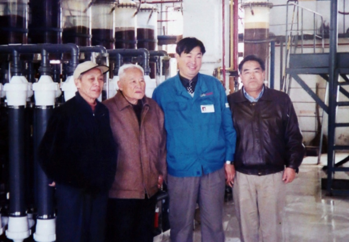 時(shí)光回到2000年的3月的一天,春寒料峭乍暖還寒,91歲高齡的曾院士邁著穩(wěn)健步子,在黃海水產(chǎn)研究所科研人員的陪同下來到明月海藻集團(tuán)老廠區(qū),張國防董事長(zhǎng)陪同調(diào)研考察碘醇車間。碘醇車間是利用海帶浸泡水制取碘和甘露醇的一條生產(chǎn)線,曾院士邊看邊詢問工藝技術(shù)改造情況,并提出了一些意見和建議。