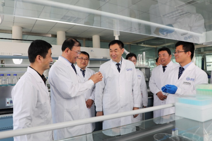 青島明月海藻集團(tuán)董事長(zhǎng)張國防(中)在國重實(shí)驗(yàn)室交流產(chǎn)品研發(fā)工作
