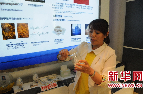 明月海藻集團(tuán)工作人員展示“無(wú)紡布”的特殊功效